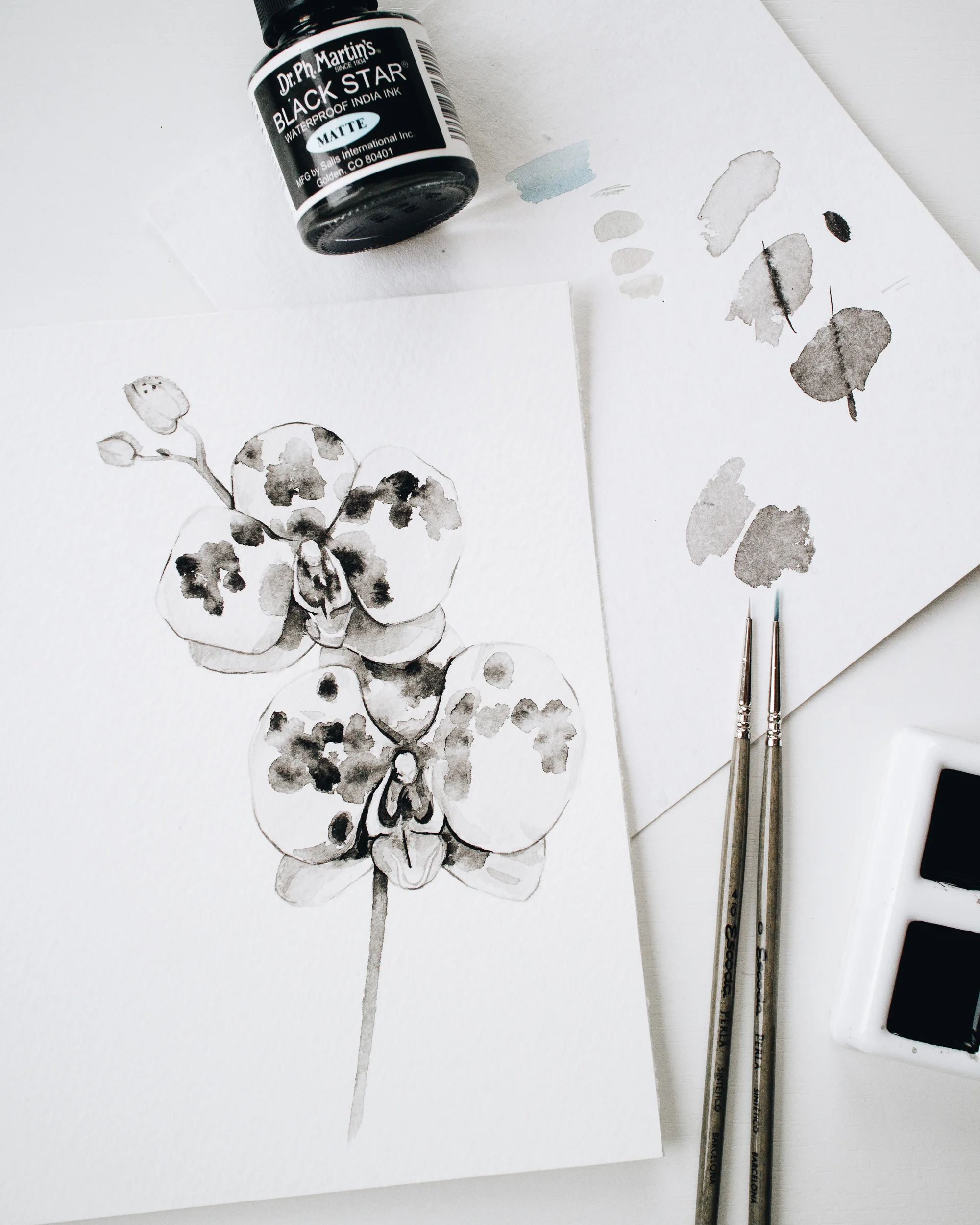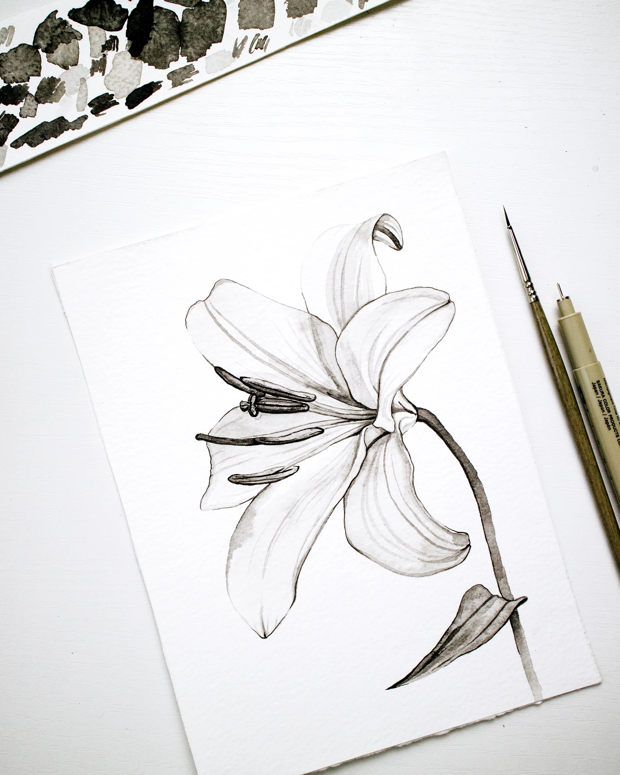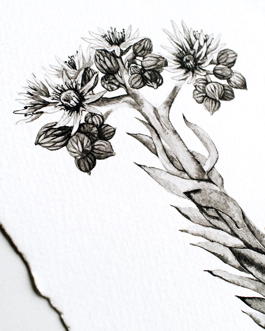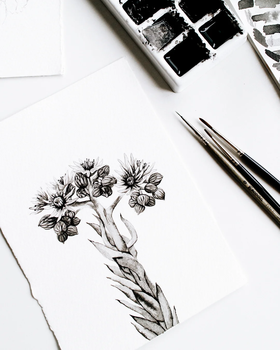 More about materials: each flower was painted on 600 gsm cold press watercolor paper, that has an amazing texture quality. Black india ink with matte finish was an obvious choice, together with Micron liner pens for adding the final touches and smallest details. Browse the gallery of the entire collection of black & white flowers here